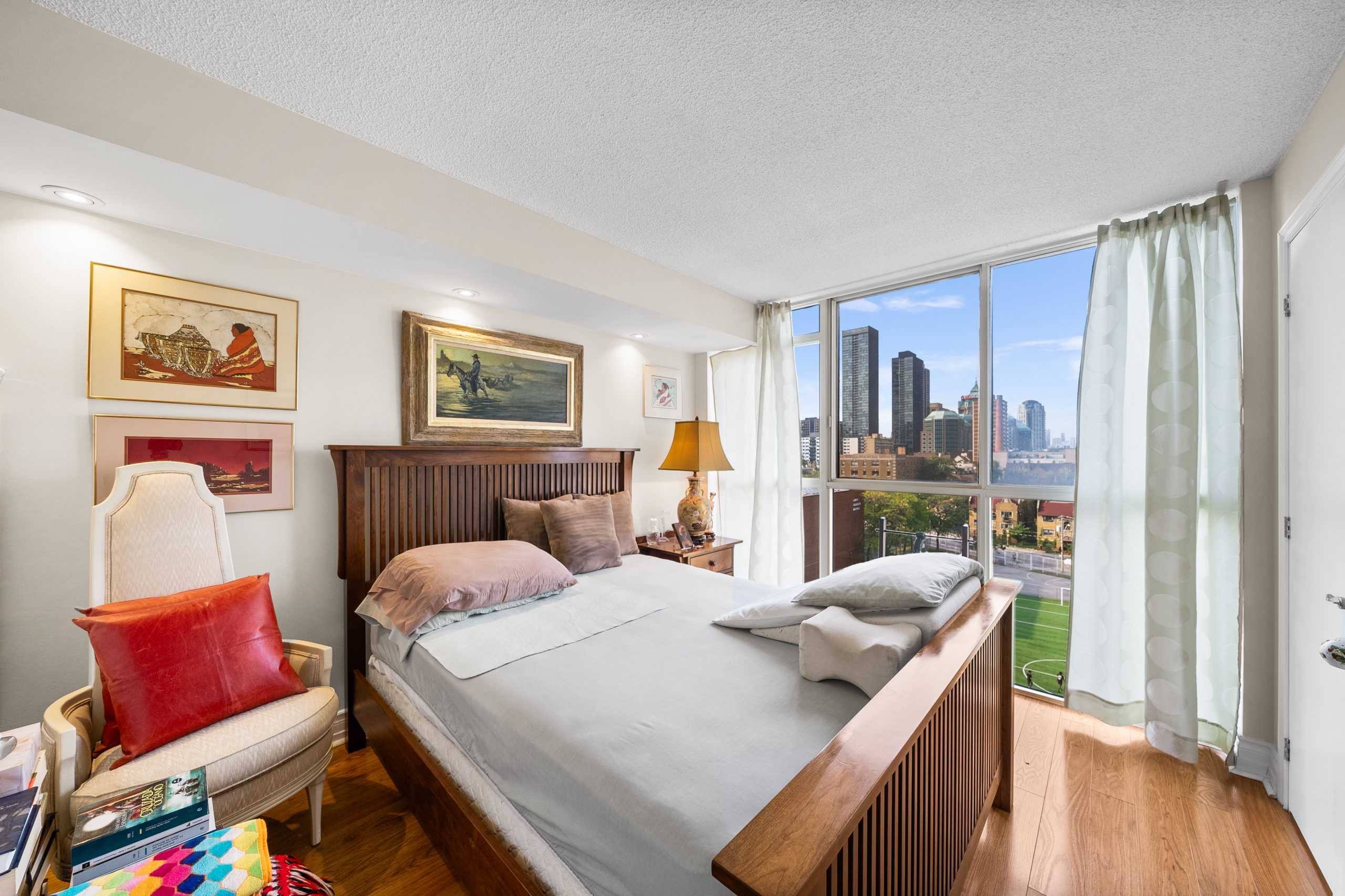 Renovated and modern 2-bedroom condo in Downtown Toronto! Unit 906 is the sprawling 830 sq. ft. 2-bedroom condo you’ve been waiting for in lively & historic Cabbagetown! This suite boasts beautiful unobstructed views from oversized floor-to-ceiling, wall-to-wall windows that fill the space with natural light. Enjoy gleaming hardwood floors and stylish pot lights throughout.