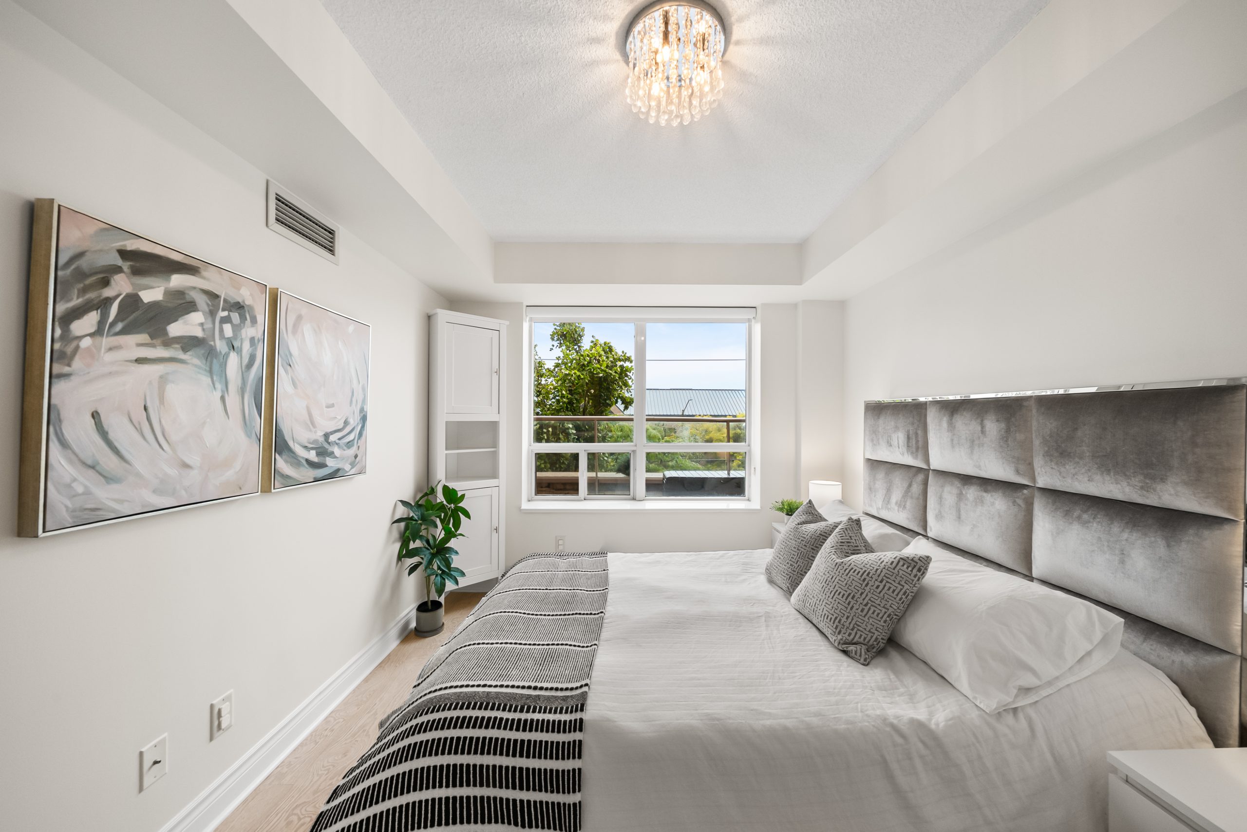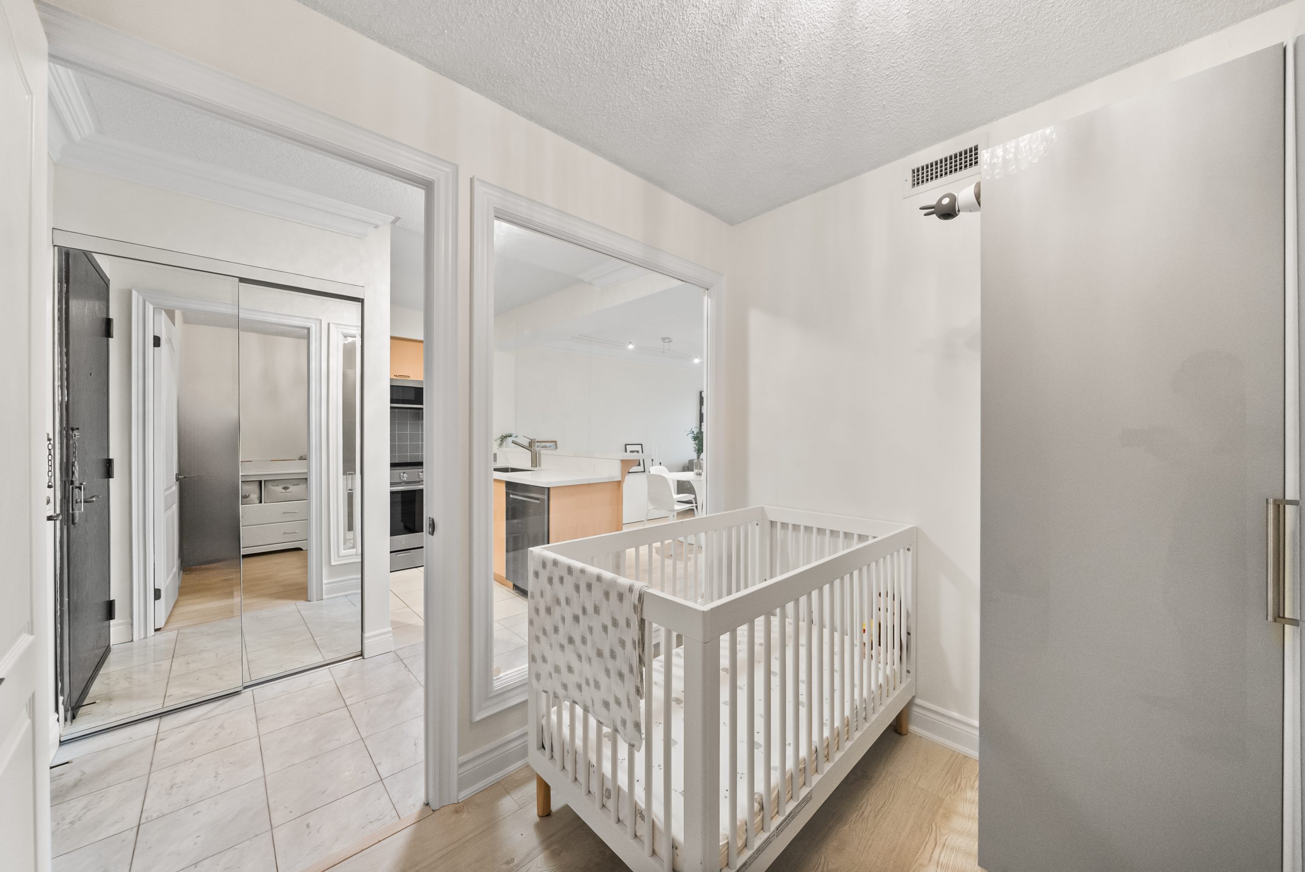 Retreat to the oversized, sun-filled primary bedroom, complete with a double closet, large windows, and chic light fixture. The spacious den offers versatility, easily functioning as a second bedroom, home office, or guest suite, thanks to its generous size and interior-facing window that welcomes natural light. The updated 4-piece bathroom impresses with modern finishes, generous storage, and a wide vanity for everyday ease.