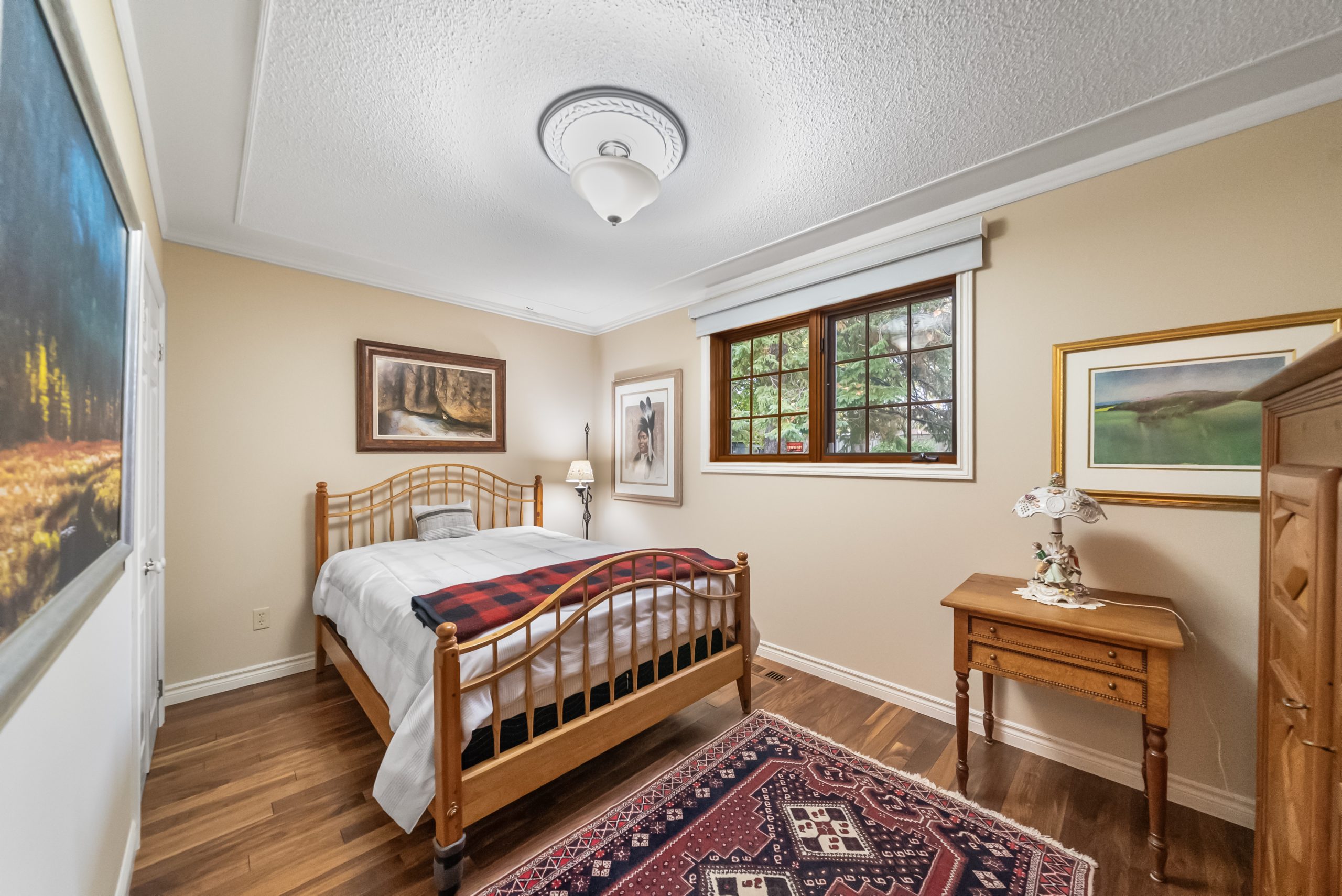 The primary bedroom is a private space with a walk-in closet and 2-pc ensuite. Two additional well-appointed bedrooms provide plenty of space for family or guests, sharing a 4-pc bath with ample vanity storage and a linen closet. The finished basement offers an abundance of living space and storage options.