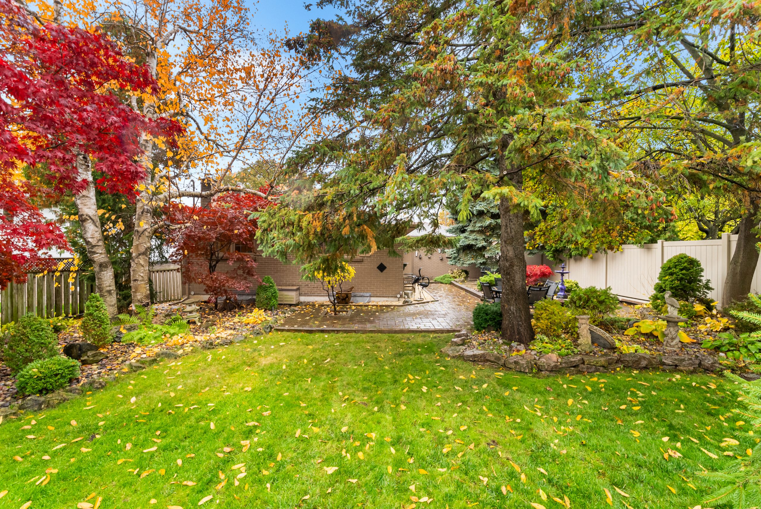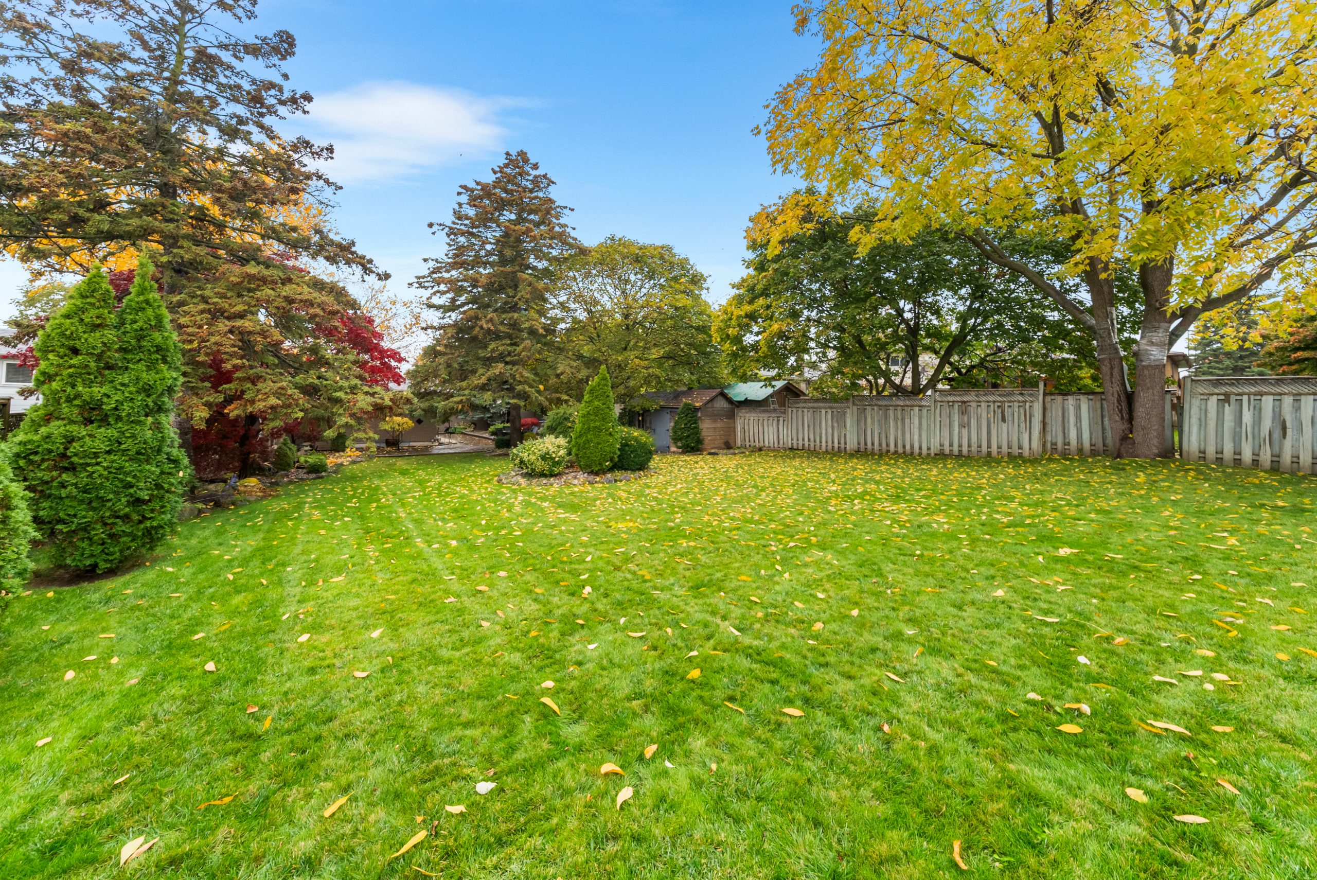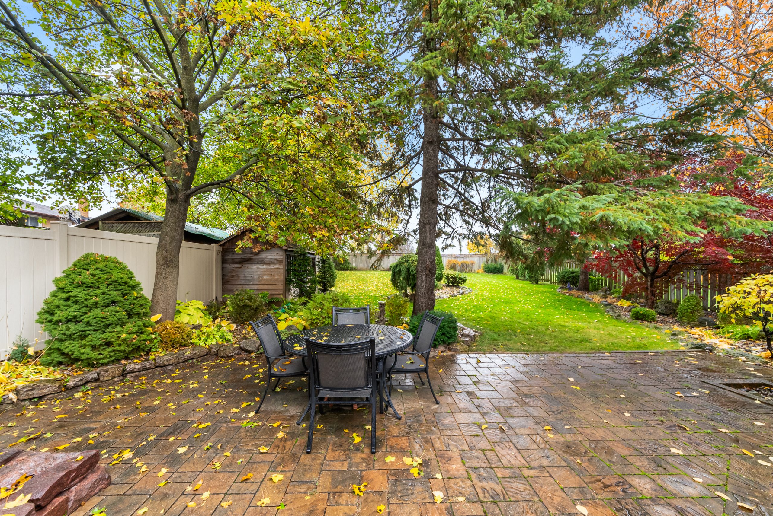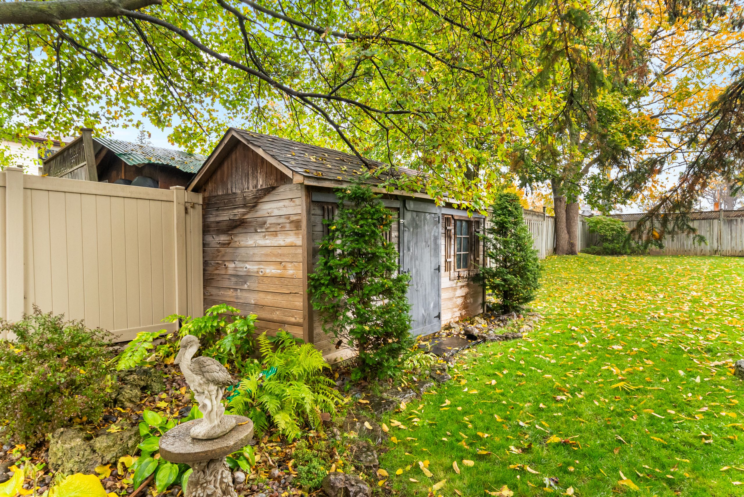 The home’s curb appeal is truly the piece-de-resistance. The professionally landscaped front yard features mature trees, shrubs, and perennials with in-ground sprinklers and landscape lighting. The fenced backyard oasis with a stone patio and manicured green space is perfect for children, pets, or entertaining. A 2-car garage with shelving and a garden shed offer extra storage for all your outdoor needs.