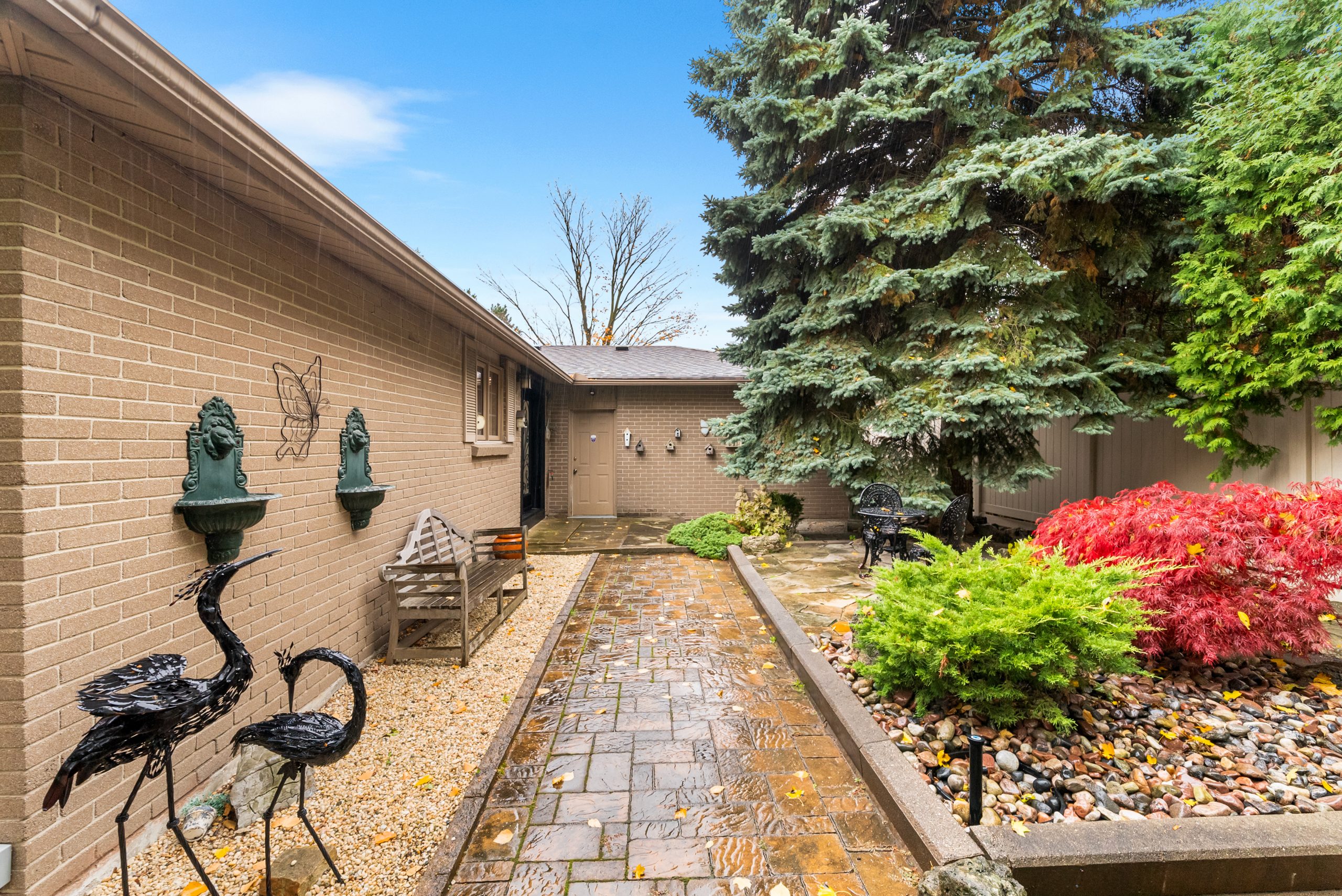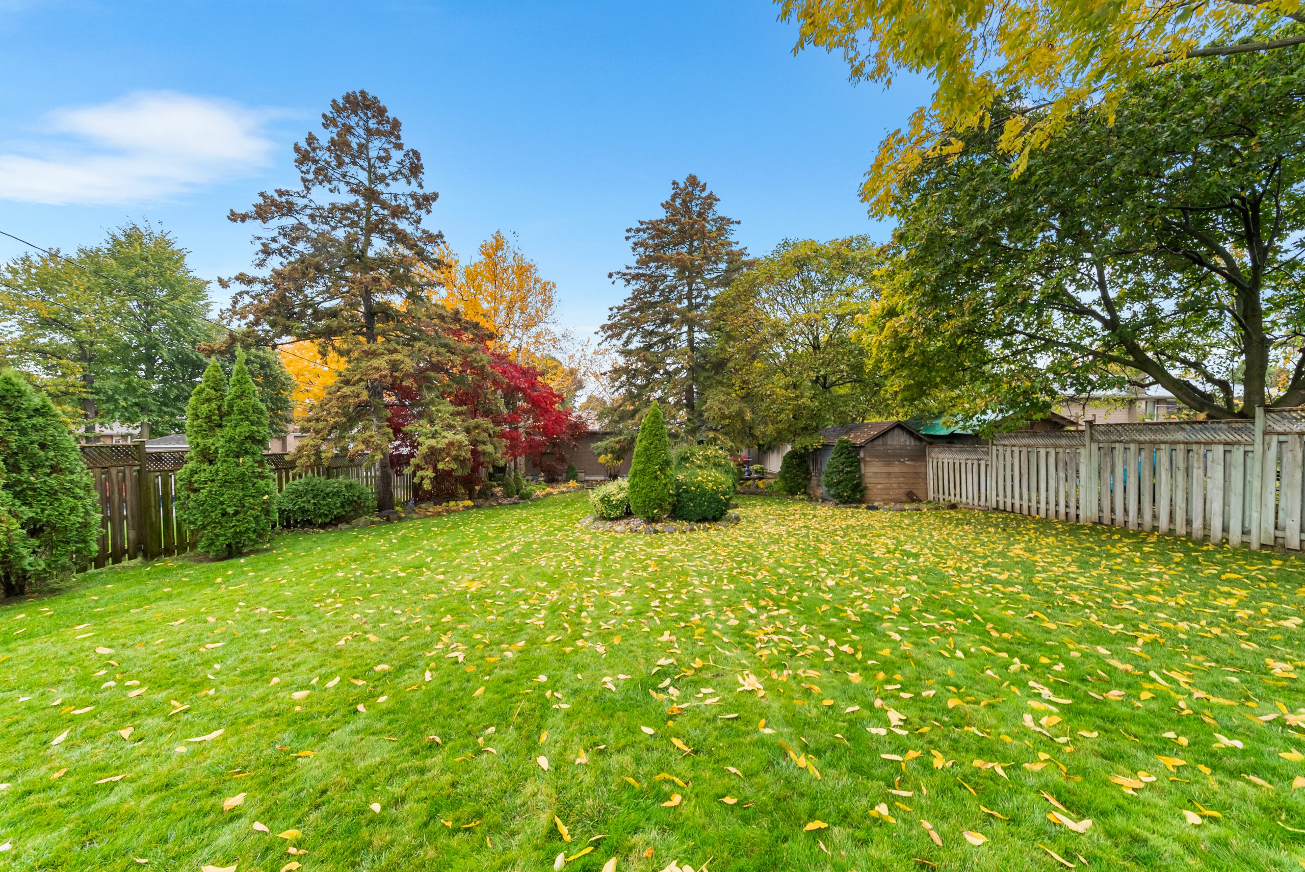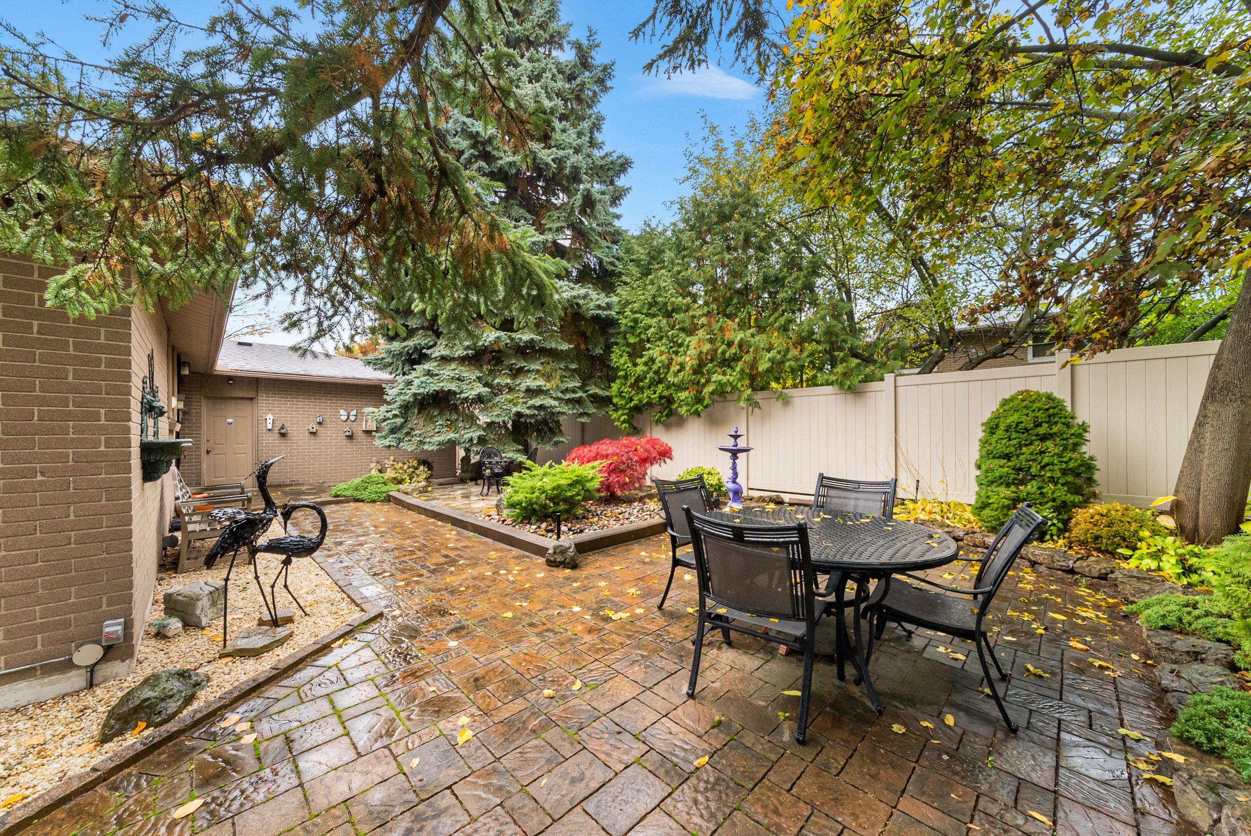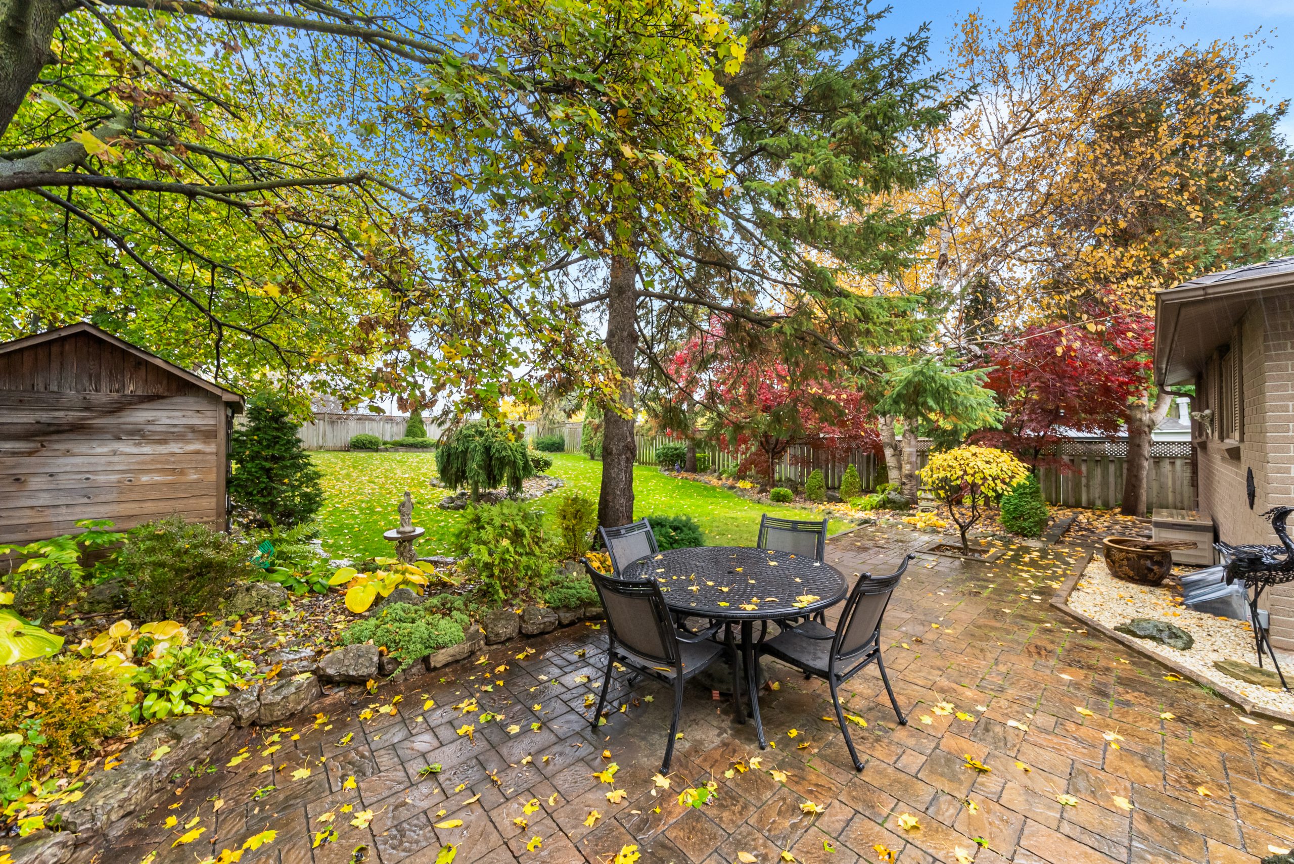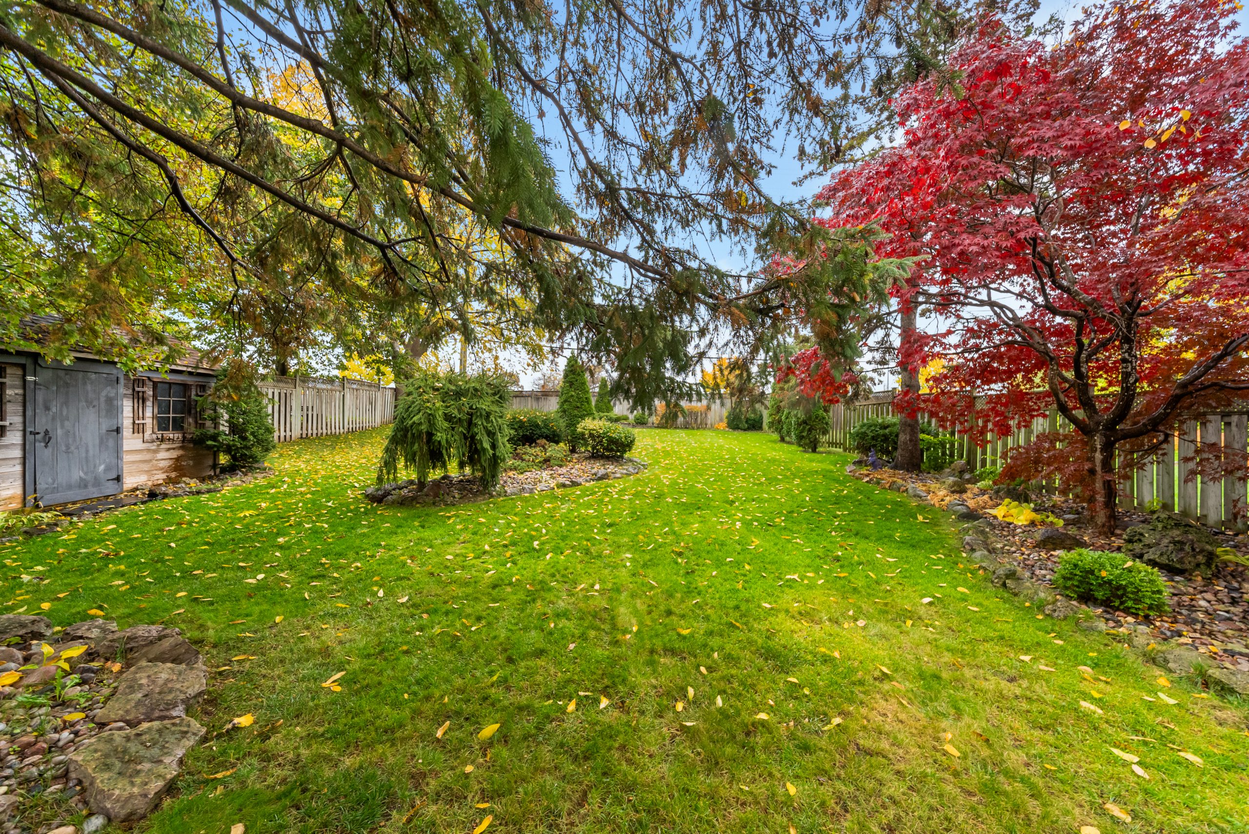 The home’s curb appeal is truly the piece-de-resistance. The professionally landscaped front yard features mature trees, shrubs, and perennials with in-ground sprinklers and landscape lighting. The fenced backyard oasis with a stone patio and manicured green space is perfect for children, pets, or entertaining. A 2-car garage with shelving and a garden shed offer extra storage for all your outdoor needs.