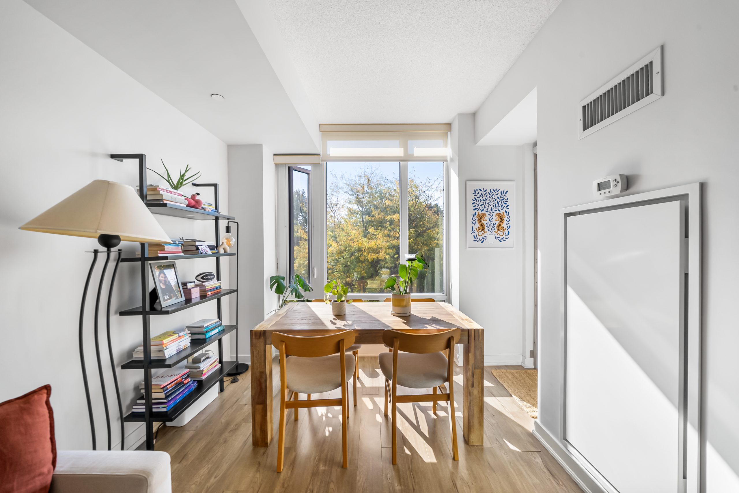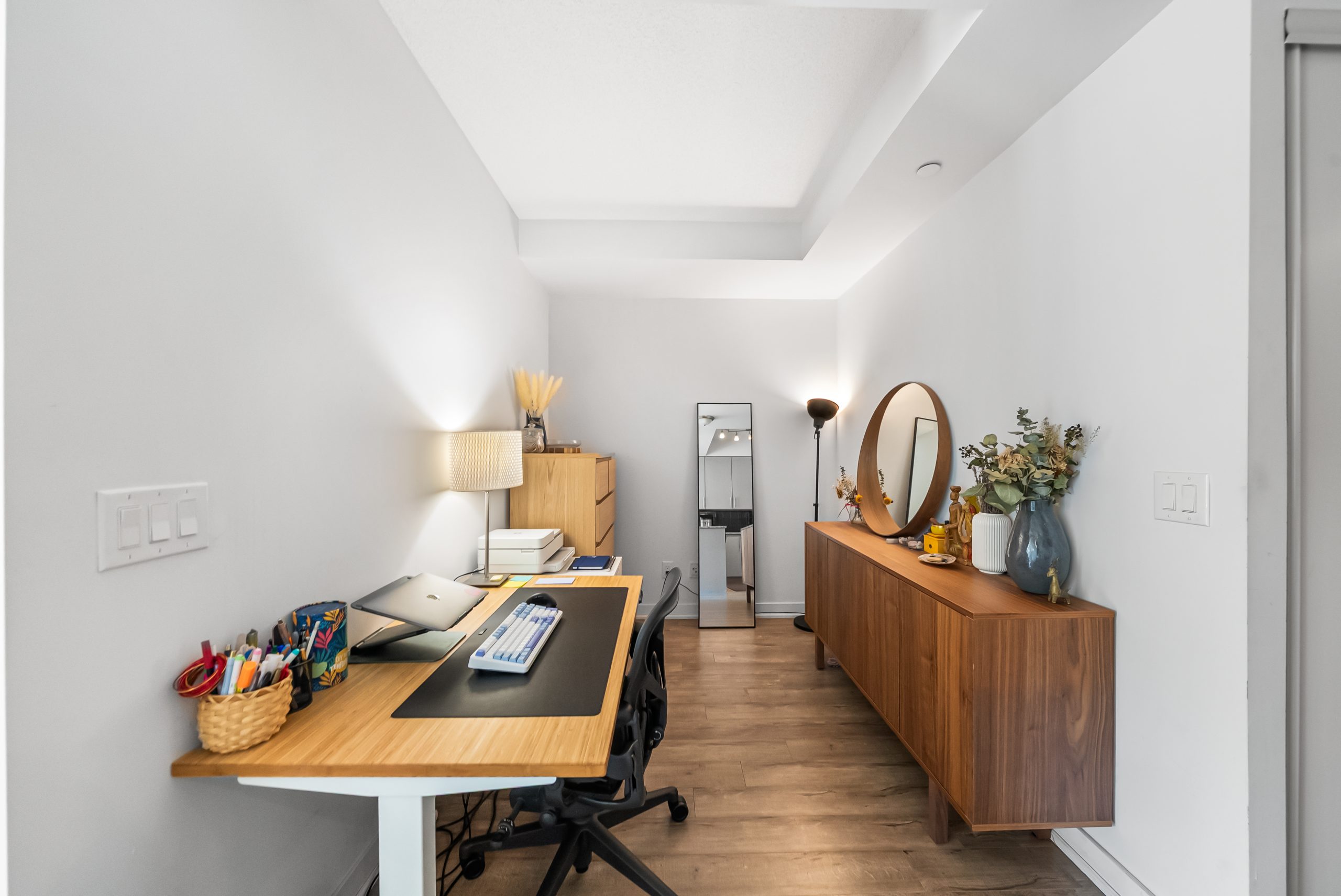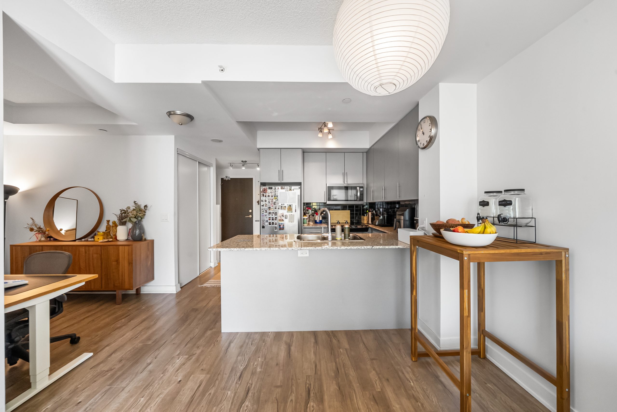 This spacious and light-filled 1-bedroom plus den unit features soaring 9-foot ceilings and an open-concept layout, creating a welcoming and modern living space. Large windows flood the interior with natural light, while the private balcony offers serene views of a tree-lined street. The contemporary kitchen is equipped with sleek stone countertops, stainless steel appliances, and a convenient breakfast bar, ideal for casual dining. The combined living and dining area flows seamlessly, perfect for both relaxation and hosting.