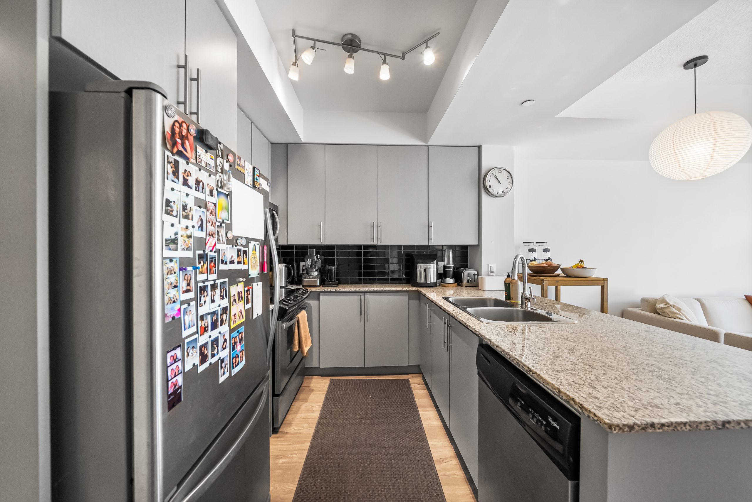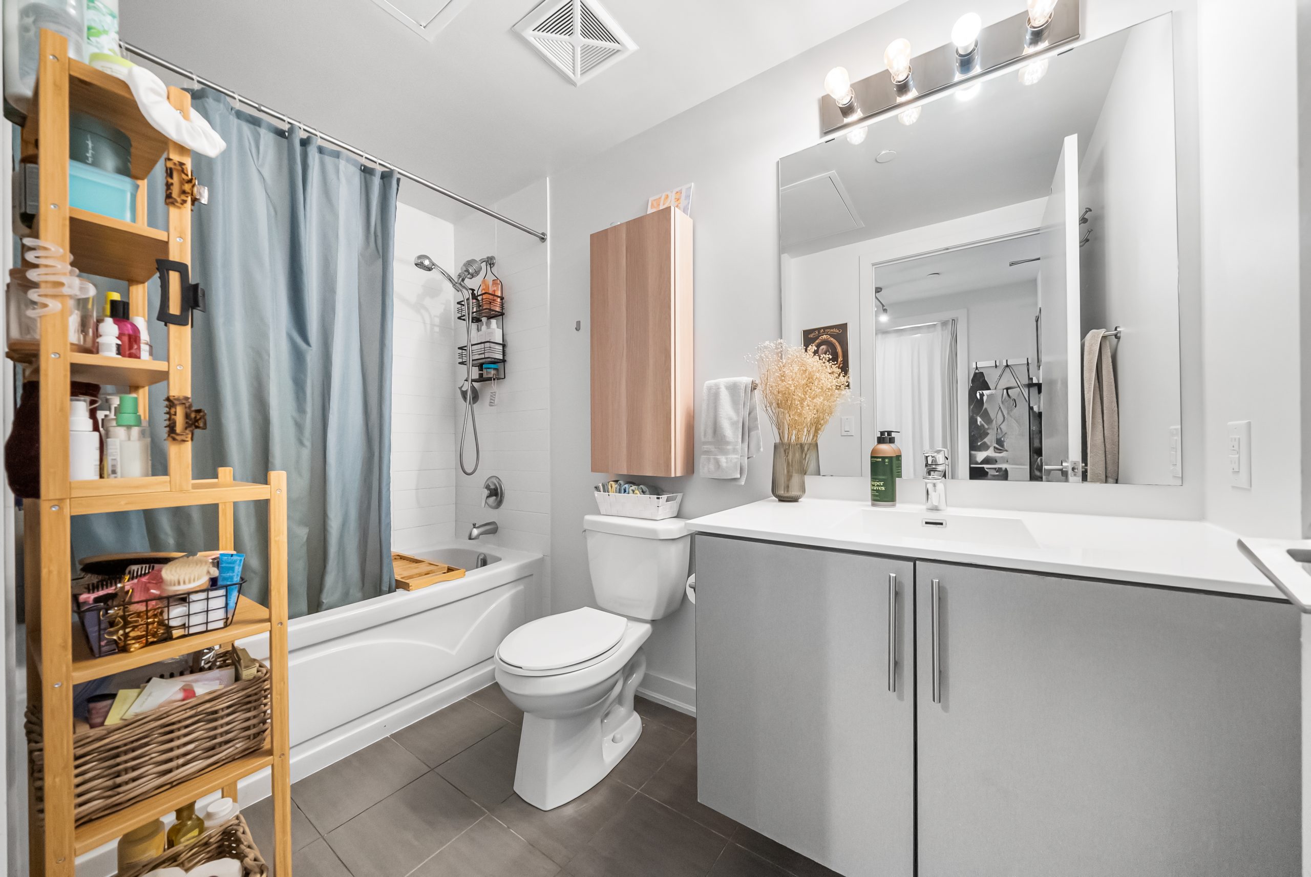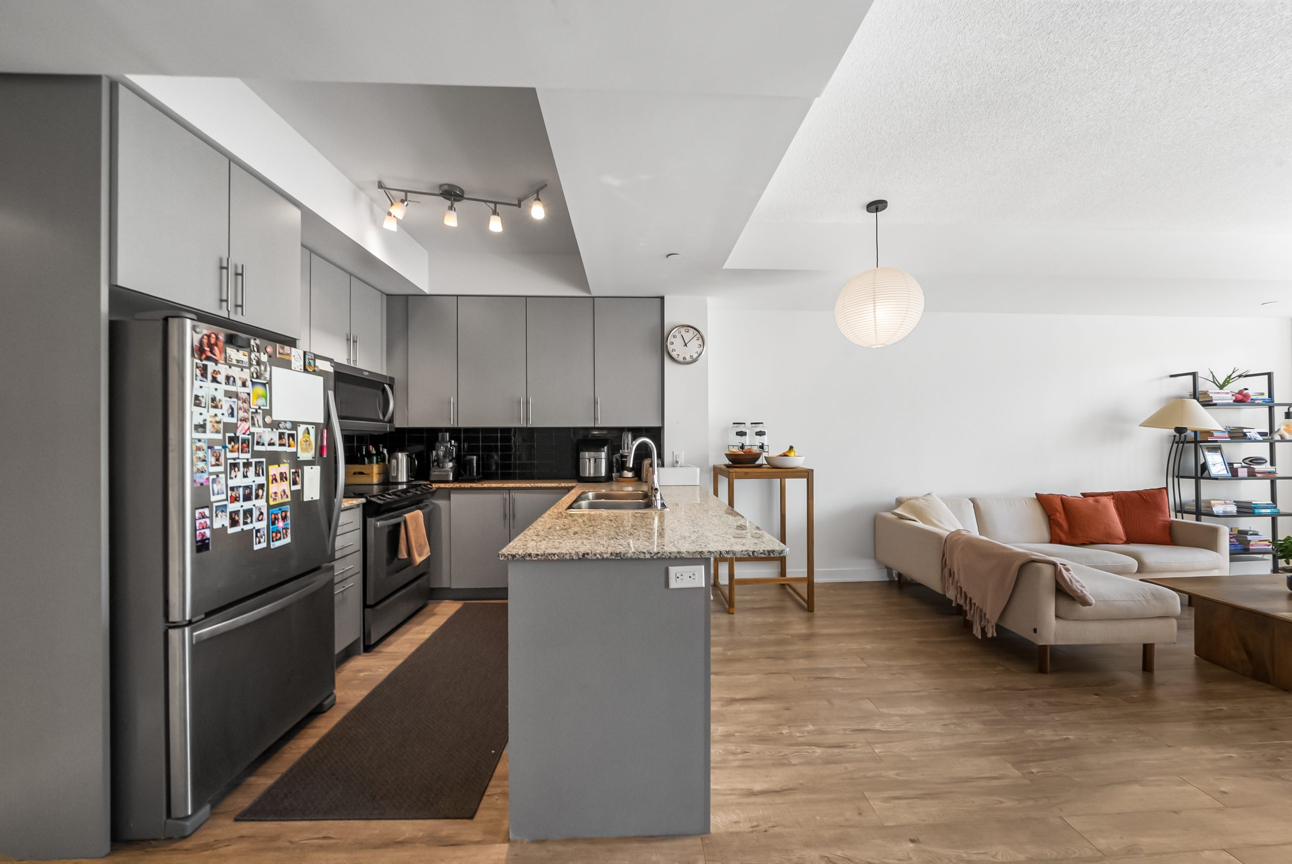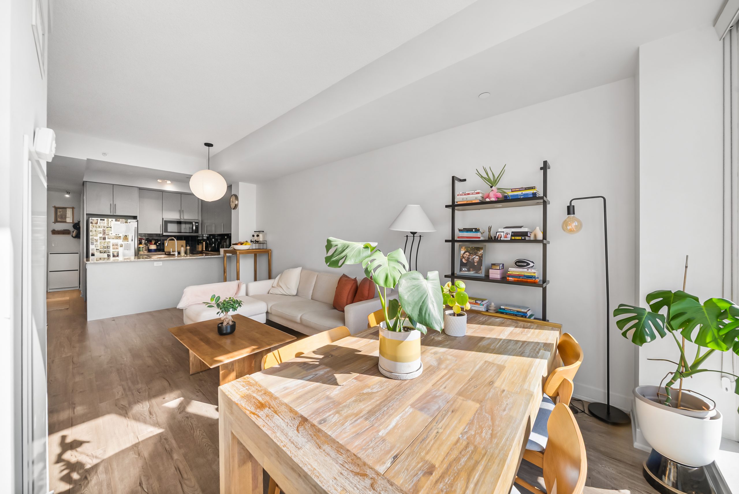 This spacious and light-filled 1-bedroom plus den unit features soaring 9-foot ceilings and an open-concept layout, creating a welcoming and modern living space. Large windows flood the interior with natural light, while the private balcony offers serene views of a tree-lined street. The contemporary kitchen is equipped with sleek stone countertops, stainless steel appliances, and a convenient breakfast bar, ideal for casual dining. The combined living and dining area flows seamlessly, perfect for both relaxation and hosting.